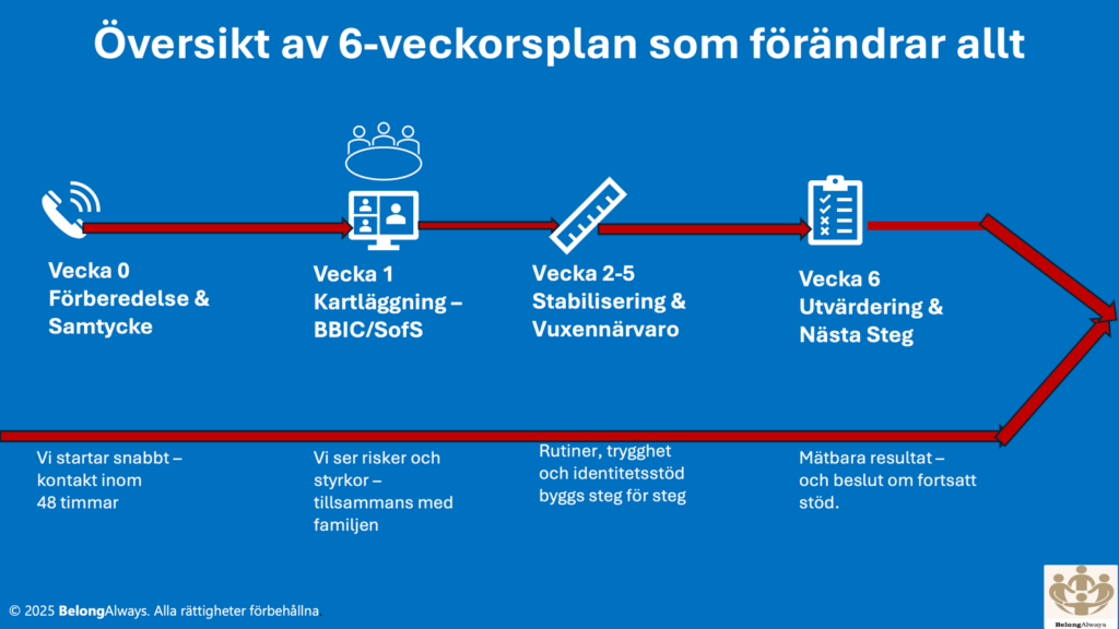 Vårt ansvar slutar inte när den akuta krisen är avvärjd. Genom vår strukturerade 12-månadersplan säkerställer vi att den initiala förändringen utvecklas till varaktig stabilitet för barn, unga och vuxna.